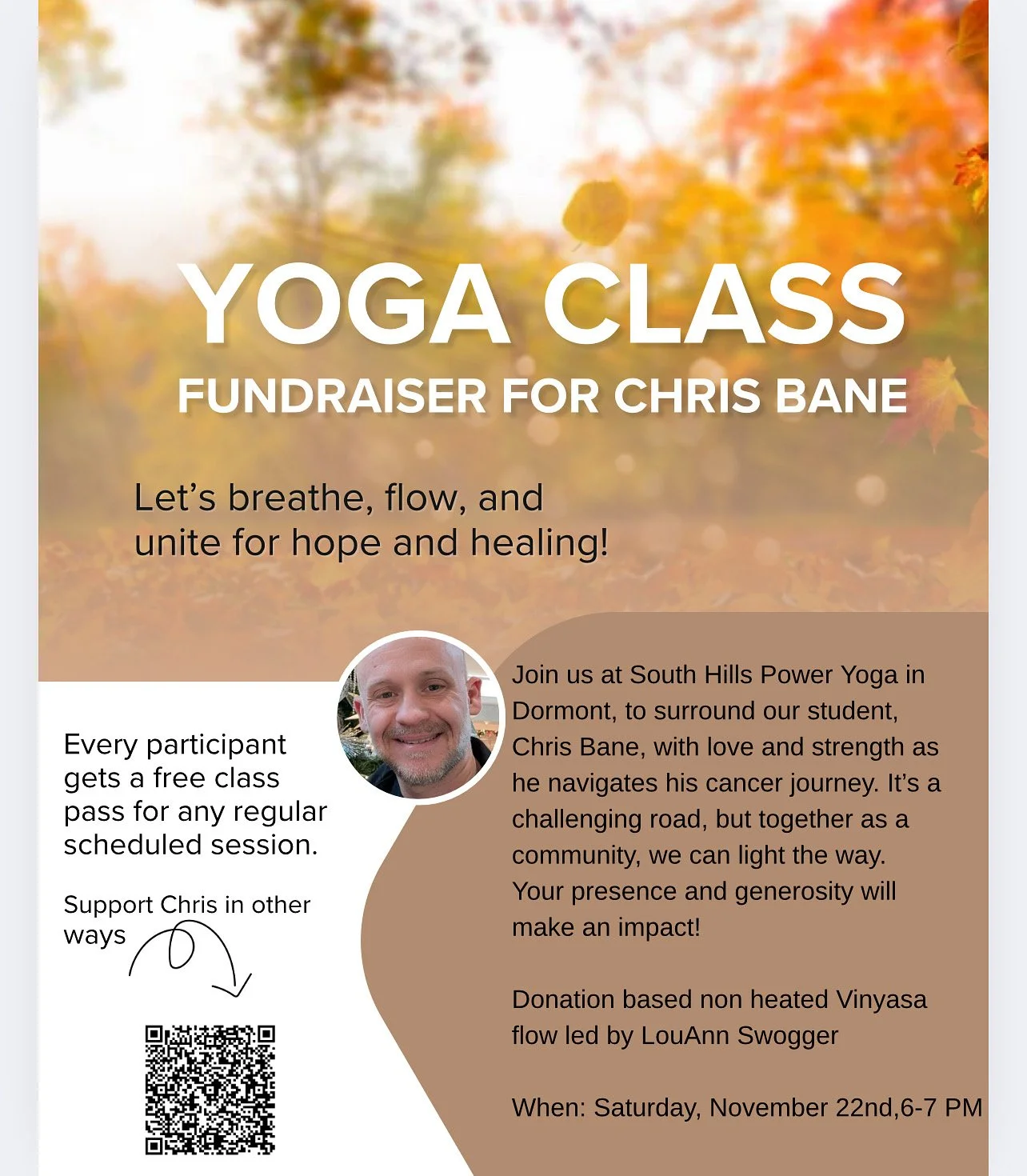 Join us at South Hills Power Yoga in Dormont, to surround our student, Chris Bane, with love and strength as he navigates his cancer journey. It's a challenging road, but together as a community, we can light the way.